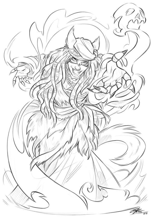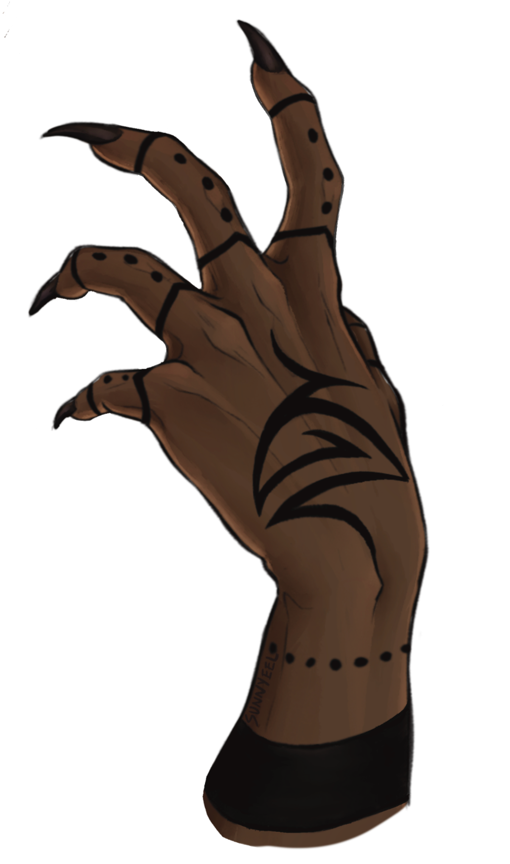 Shadowed, androgynous features peer out from under a heavy fall of faded green, twisted dreadlocks bedecked with tiny white blooms, delicate roots clinging tight amidst metal band and bone alike. Just as fragile blossoms entangle their hair, so too do the ritualistic marks upon their flesh. Three vertical 'slash' marks adorn their chin and their forehead at their hairline, and a line of dots bisect their face just under their eyes and across the bridge of their nose, from one temple to the other. Tattoos band their fingers and arms, entwine their legs, with a final pronouncement upon their back; a gnarled tree with grisly branches and grasping roots that stretches from shoulders to buttocks.A fanged earring dangles from each tufted ear, and at first glance would appear to be a prize plucked from the jaws of a beast. If one were perceptive enough, they might actually recognize that they are, in fact, Miqo'te incisors, and not from an animal's maw at all.Upon a word or brief smile, pointed, filed teeth flash against darkened flesh. White against dusk, only to be shuttered behind plush lips that curl with the ghost of a smile. Eyes reminiscent of the dark wood mirror their mood; a gleam with their humor or a glimmer with malice. But always, always a smile of greeting.A pointed smile with teeth.
